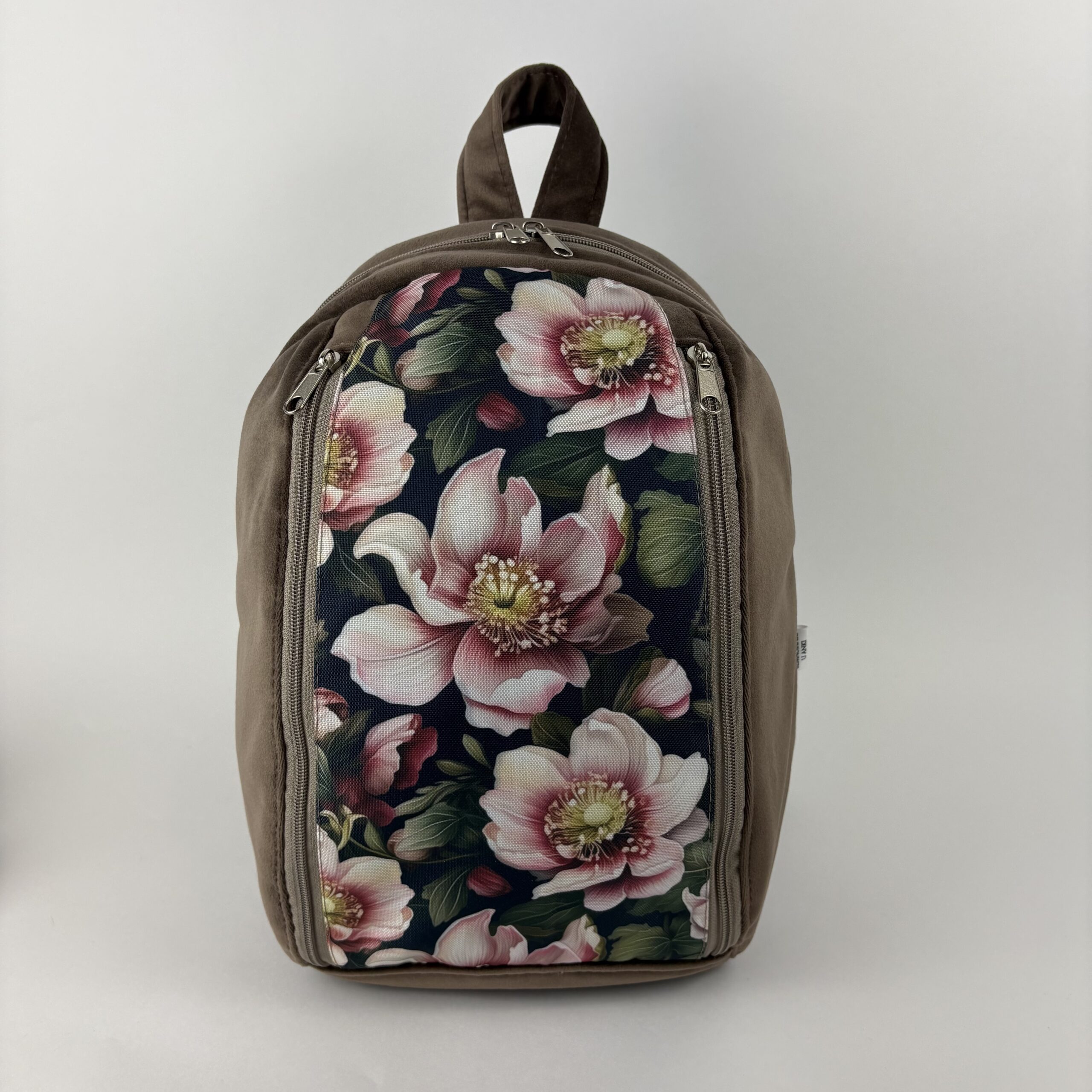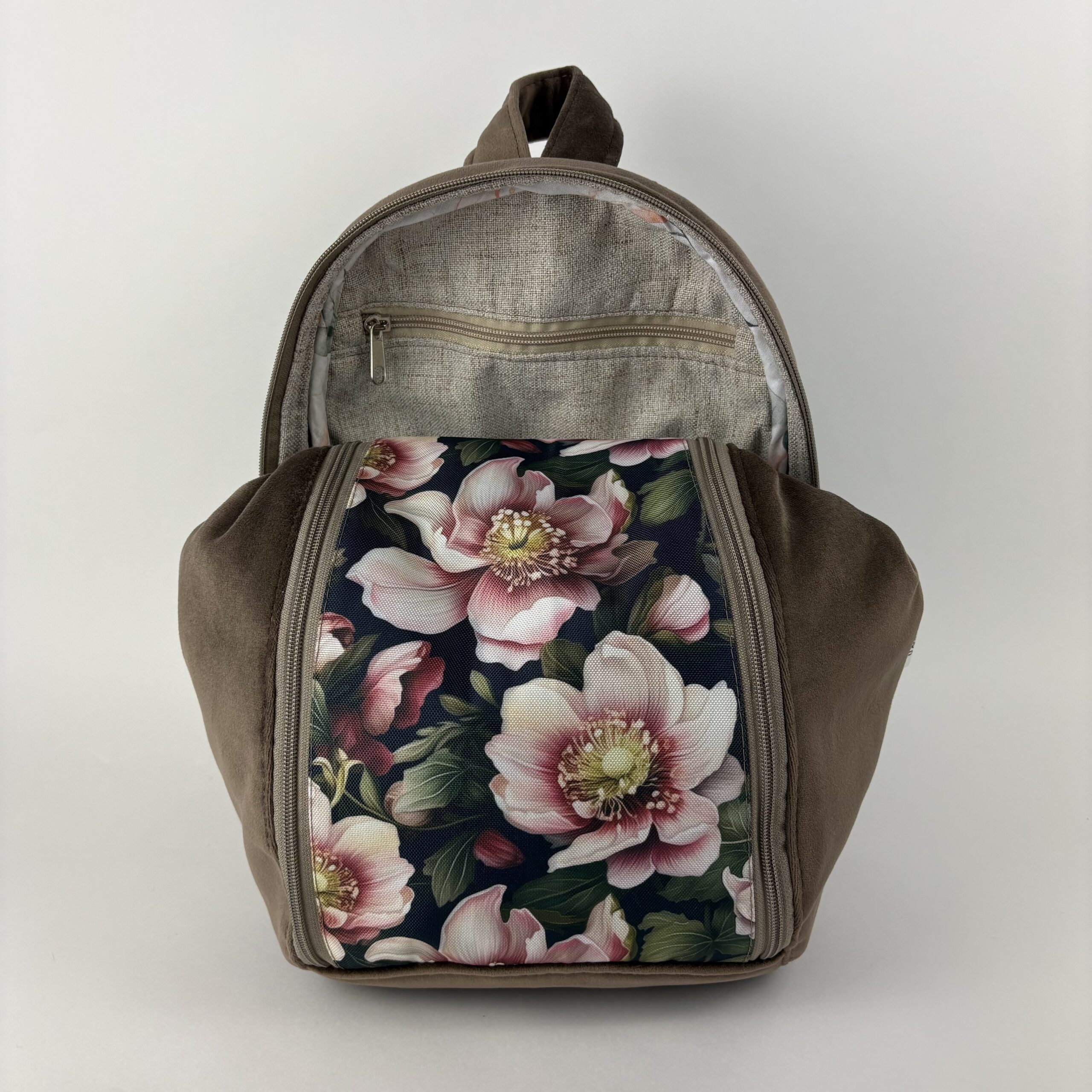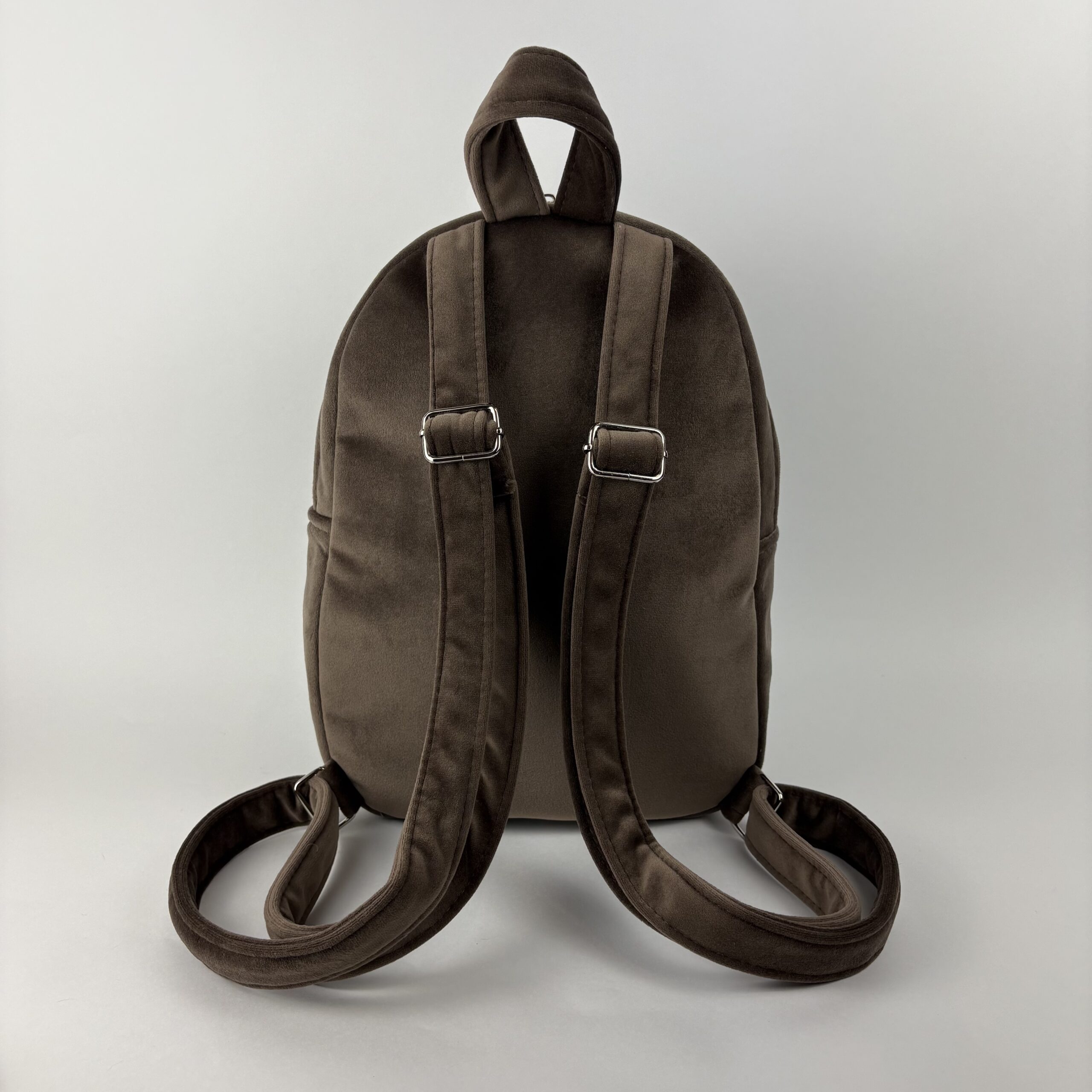 Plecak upcyklingowy z weluru tapicerskiego i tkaniny wodoodpornej, stworzony z myślą o funkcjonalności i stylu. Wnętrze wykończone zostało solidną podszewką z tkaniny tapicerskiej. Plecak jest zapinany na zamek i posiada regulowane szelki.