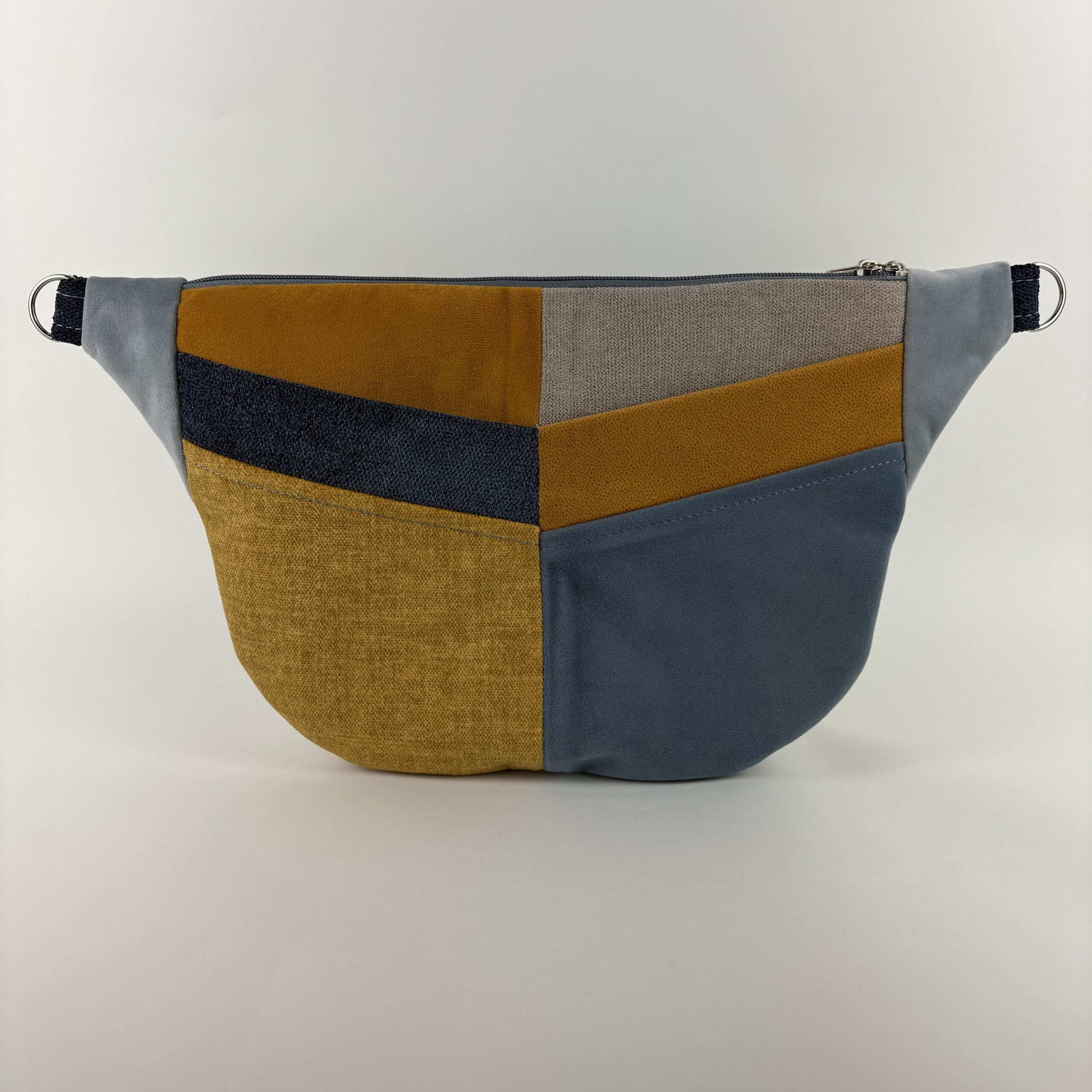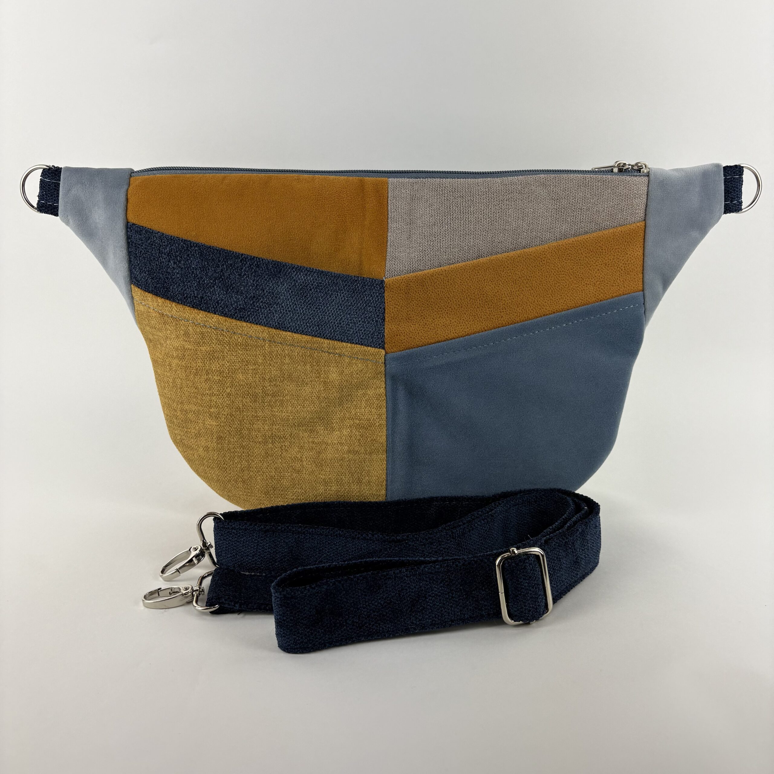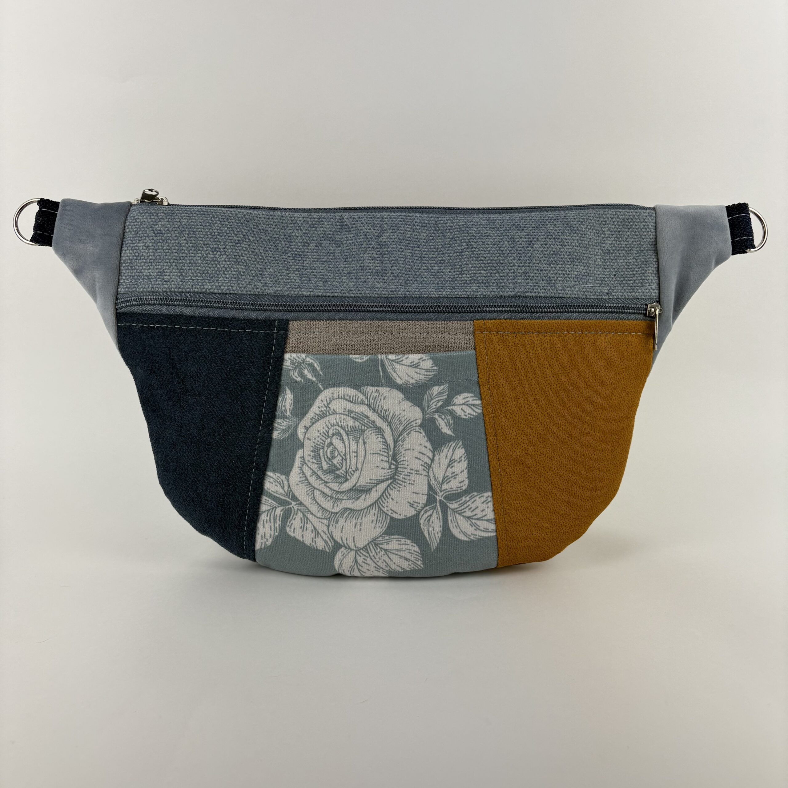 – z zewnątrz po jednej stronie dwie otwarte kieszonki, po drugiej stronie mała otwarta oraz duża kieszeń zapinana na zamek