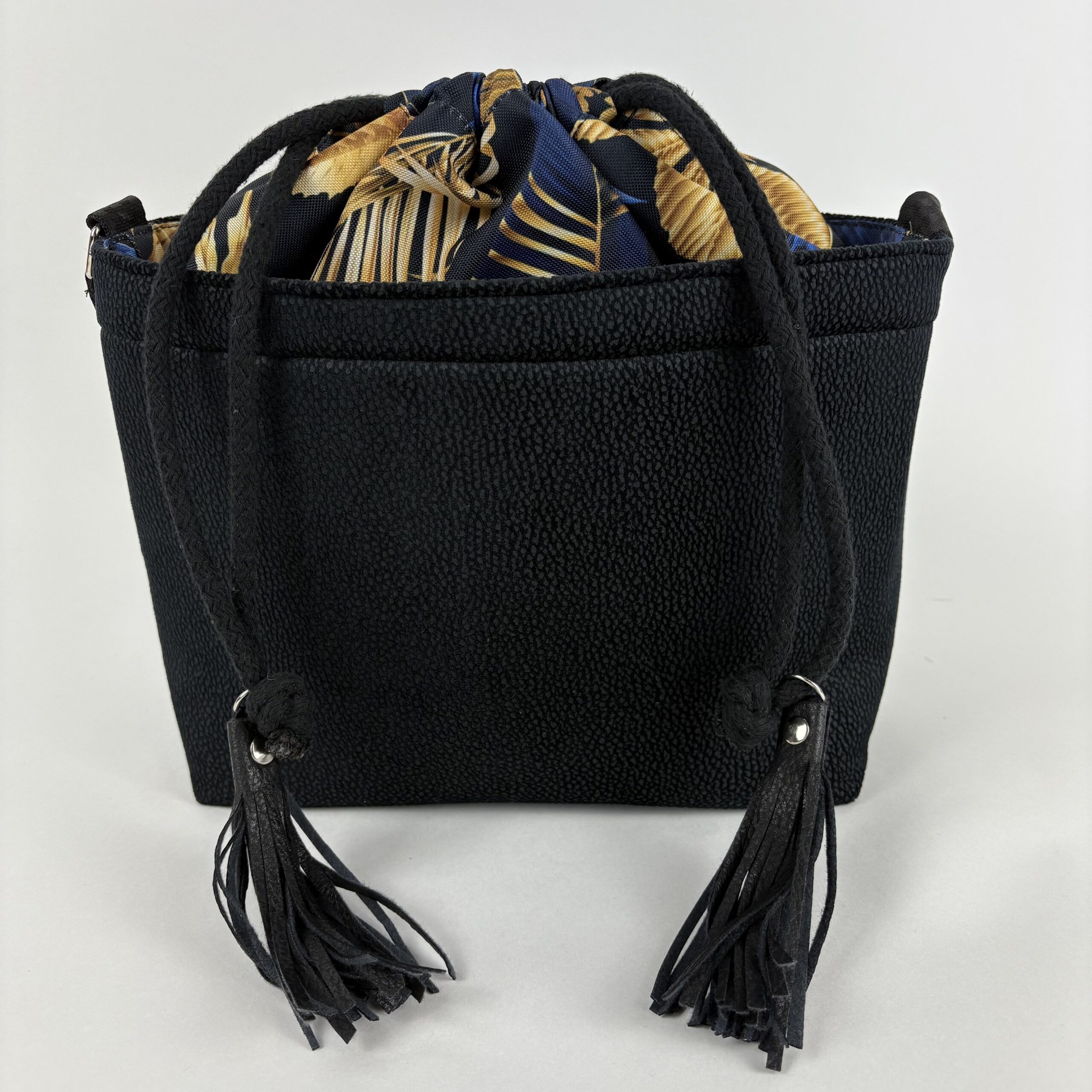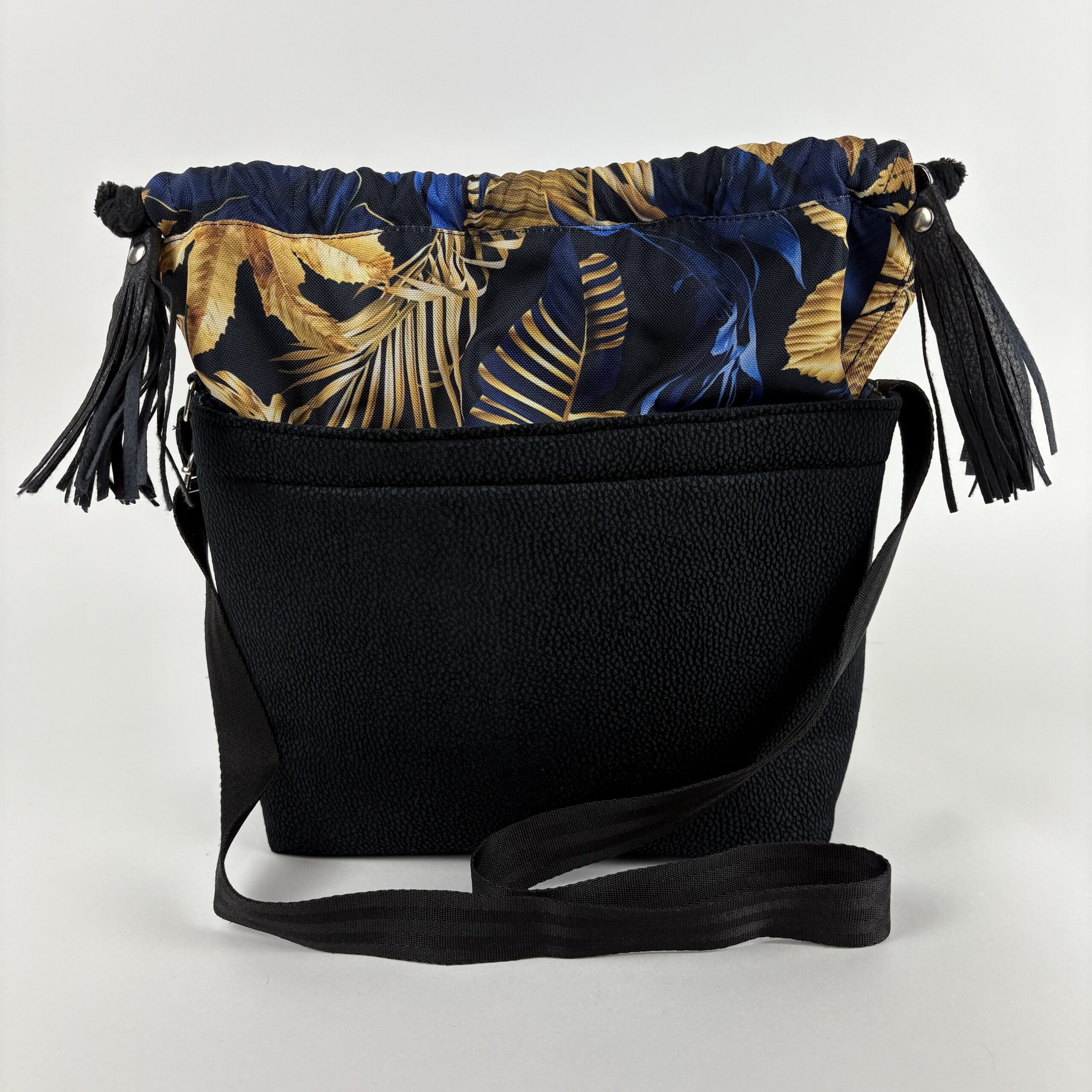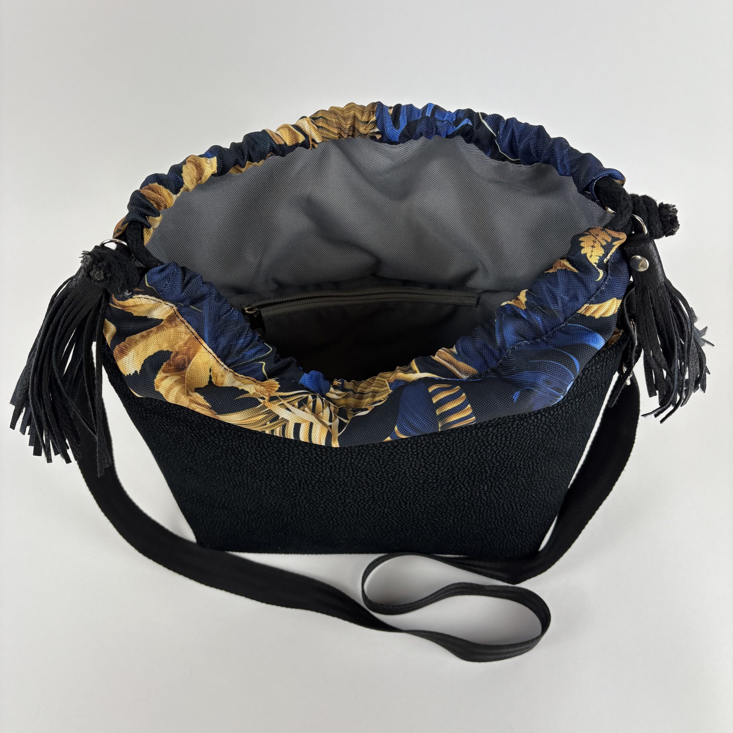 Upcyklingowa torebka z oryginalnym kominem, który można wygodnie ściągać za pomocą sznurka zakończonego frędzlami. Wykonana z odzyskanych materiałów, łączy ekologiczne podejście z unikatowym stylem. Wyposażona w regulowany pasek.