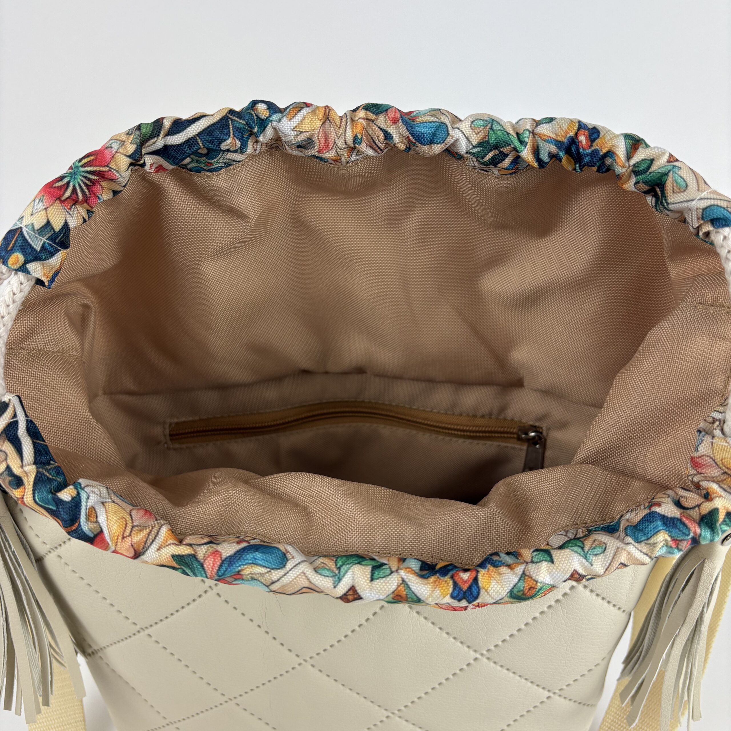 Upcyklingowa torebka z oryginalnym kominem, który można wygodnie ściągać za pomocą sznurka zakończonego frędzlami. Wykonana z odzyskanych materiałów, łączy ekologiczne podejście z unikatowym stylem. Wyposażona w regulowany pasek.