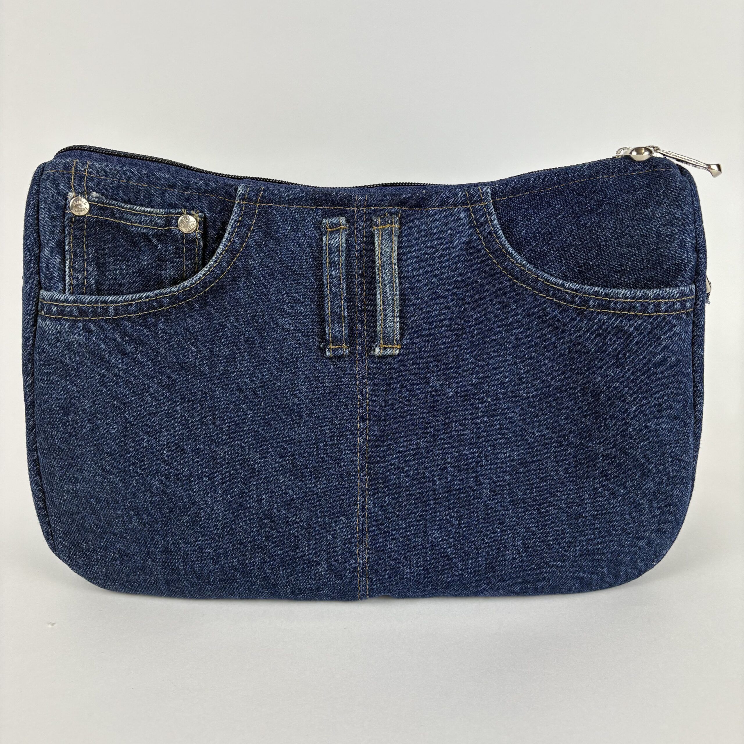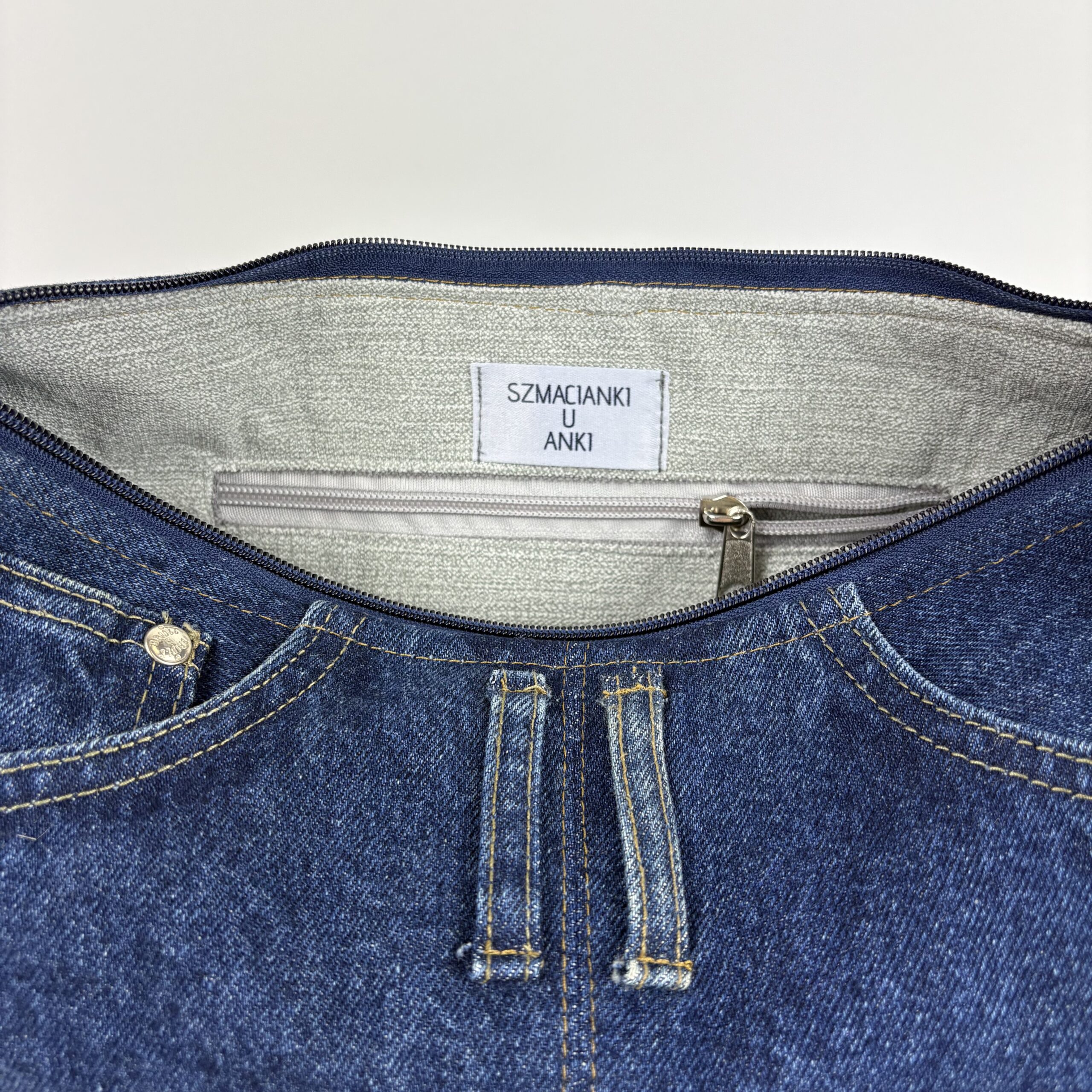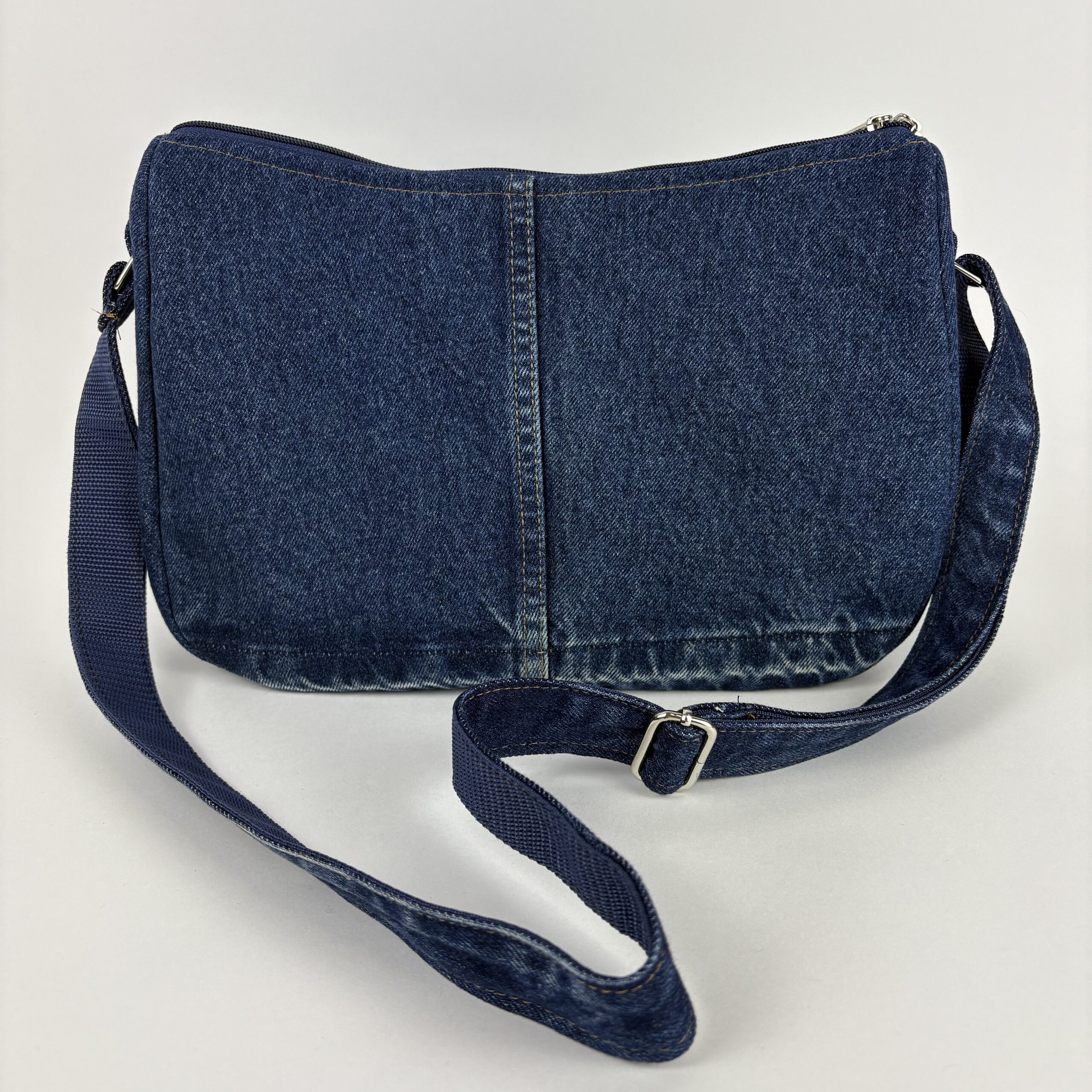 Jeansowa, upcyklingowa torebka o średnim rozmiarze, wykonana z odzyskanych materiałów denimowych. Wyposażona w regulowany pasek oraz zapięcie na zamek, zapewnia wygodę i bezpieczeństwo. Idealna na co dzień dla osób ceniących modę zrównoważoną i praktyczną.