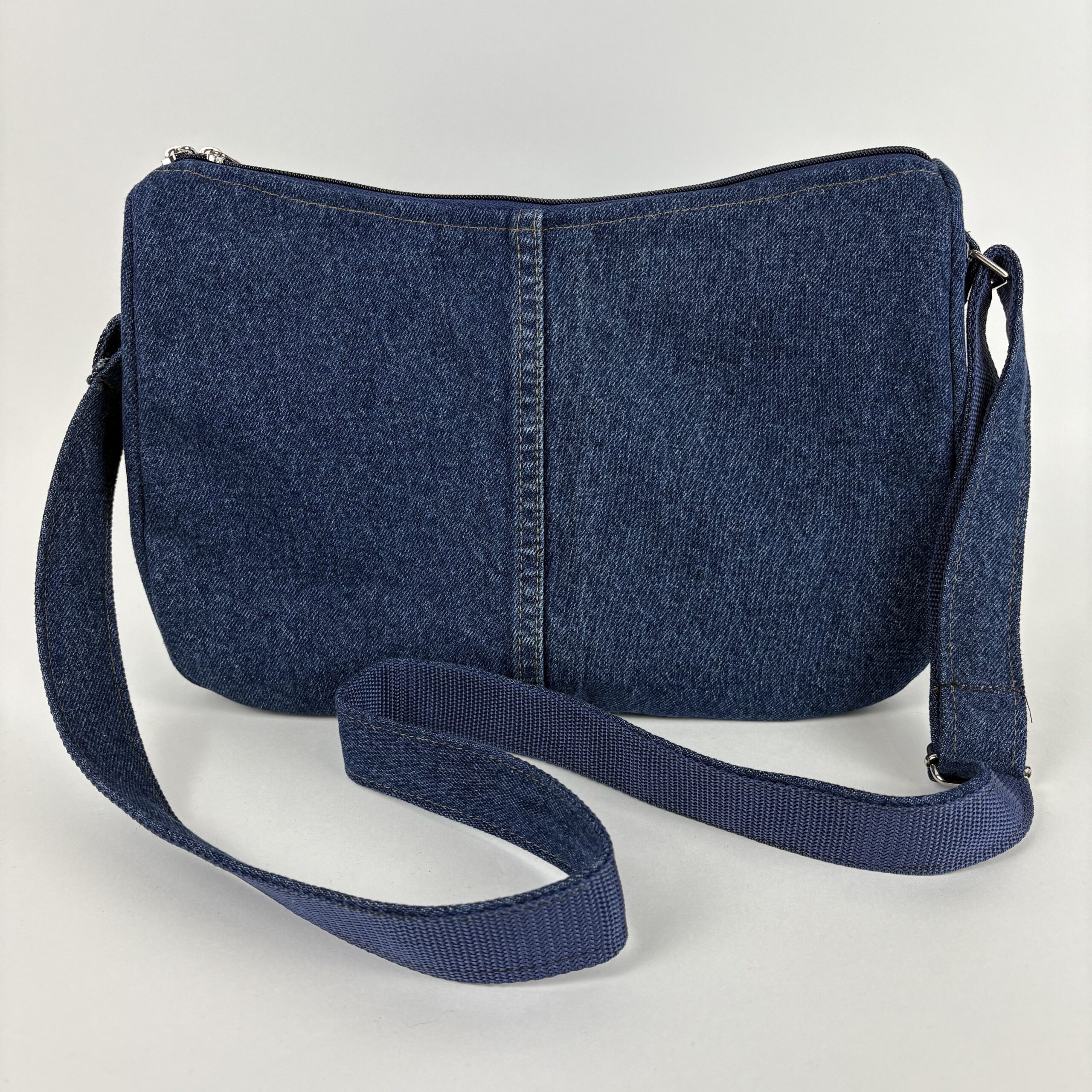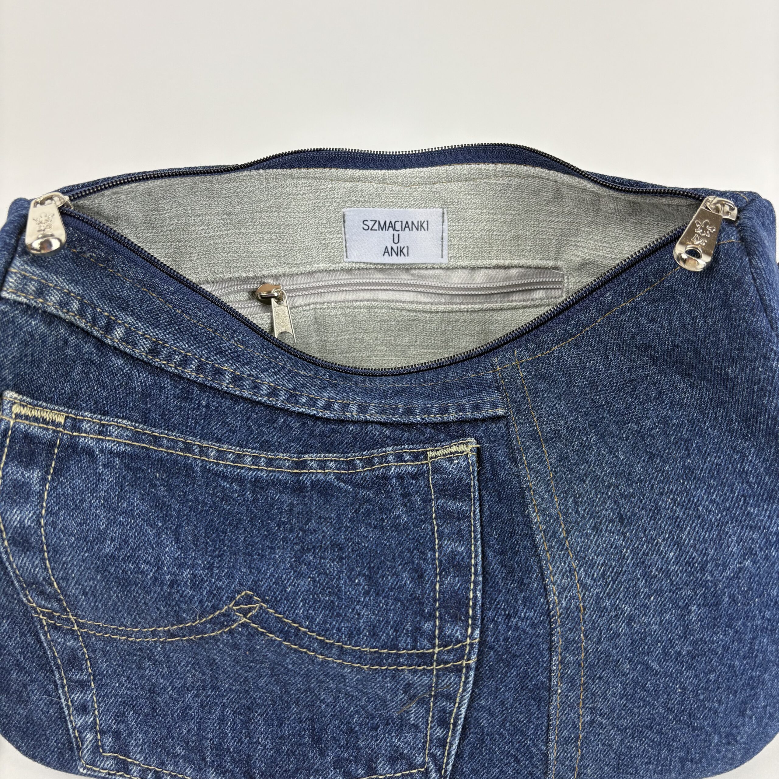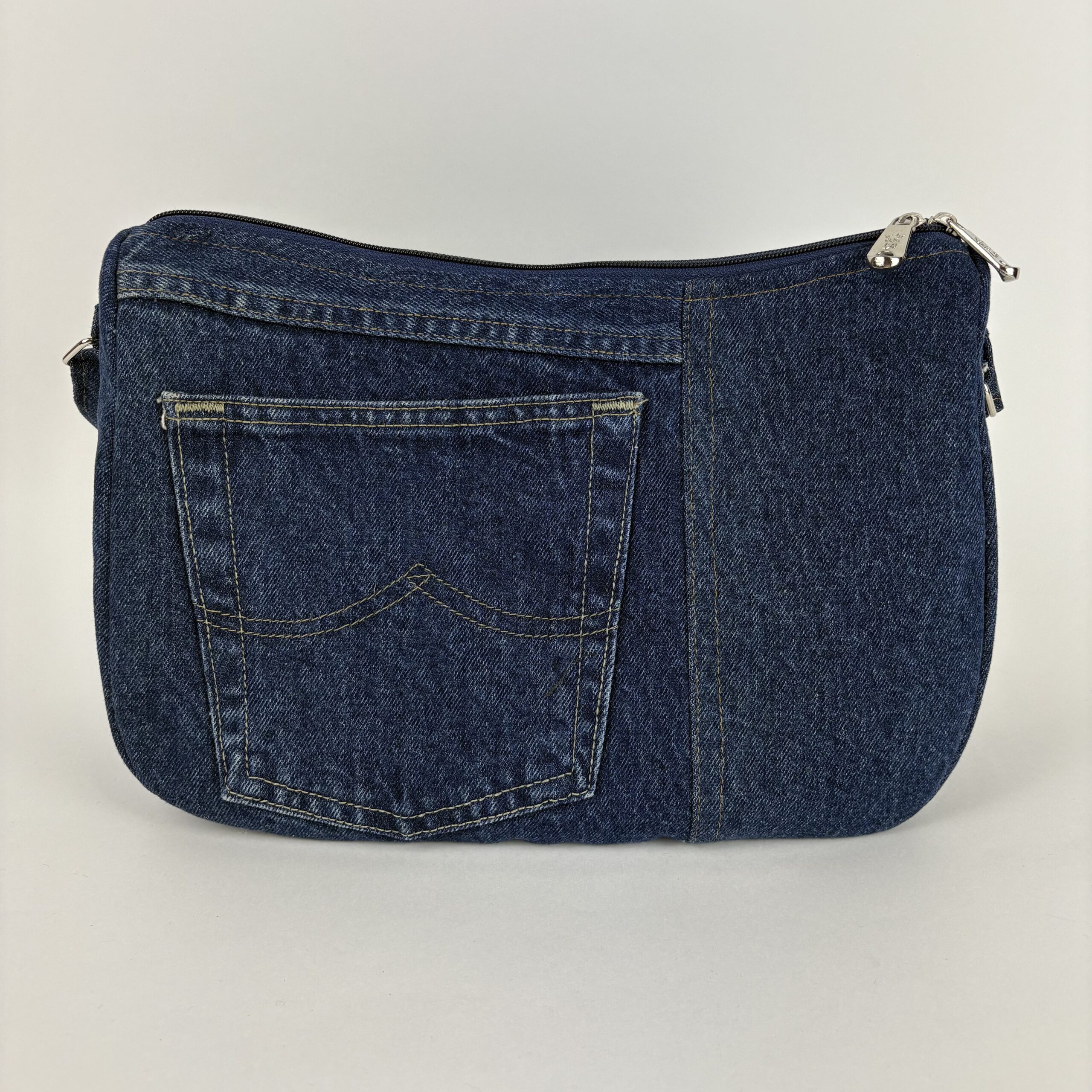Jeansowa, upcyklingowa torebka o średnim rozmiarze, wykonana z odzyskanych materiałów denimowych. Wyposażona w regulowany pasek oraz zapięcie na zamek, zapewnia wygodę i bezpieczeństwo. Idealna na co dzień dla osób ceniących modę zrównoważoną i praktyczną.