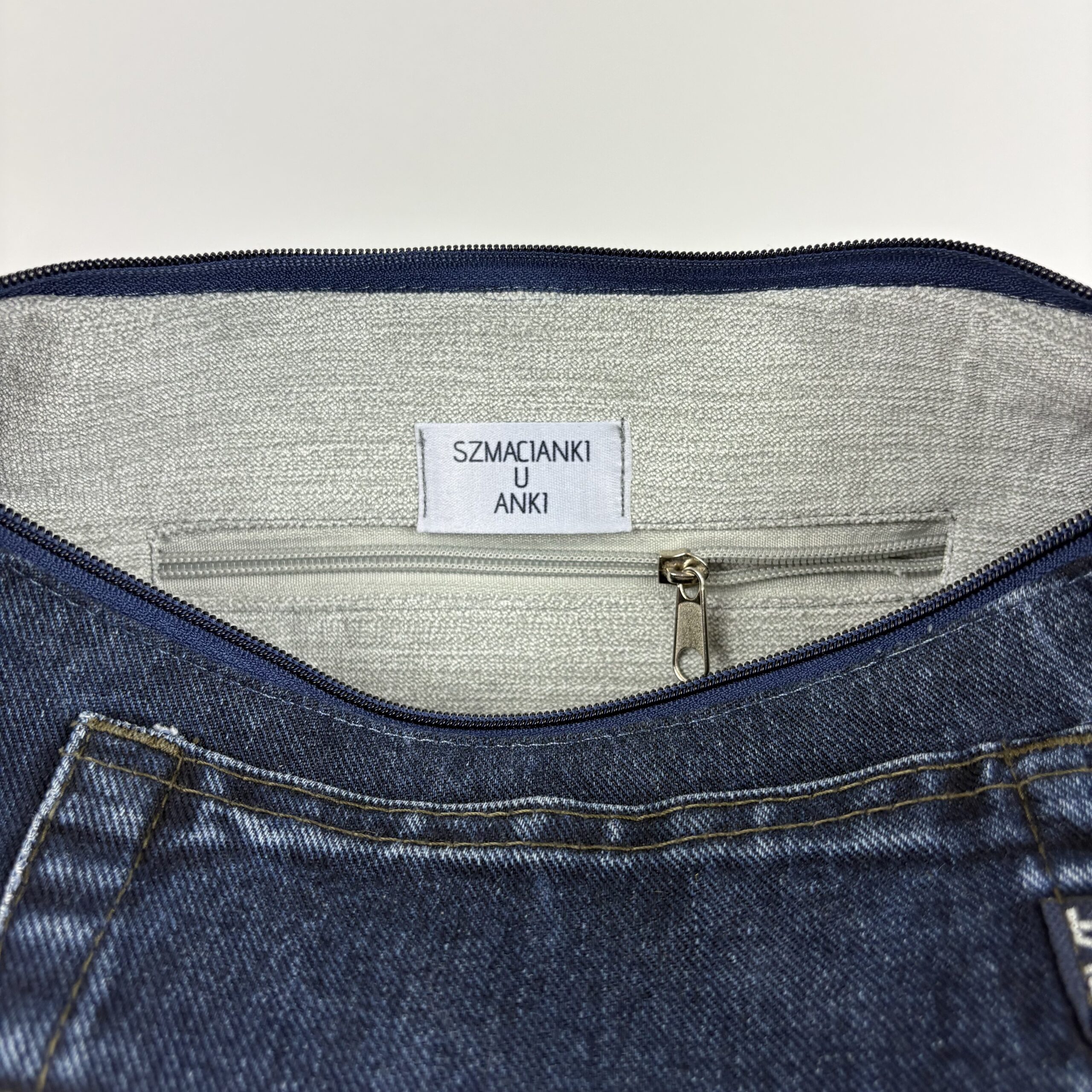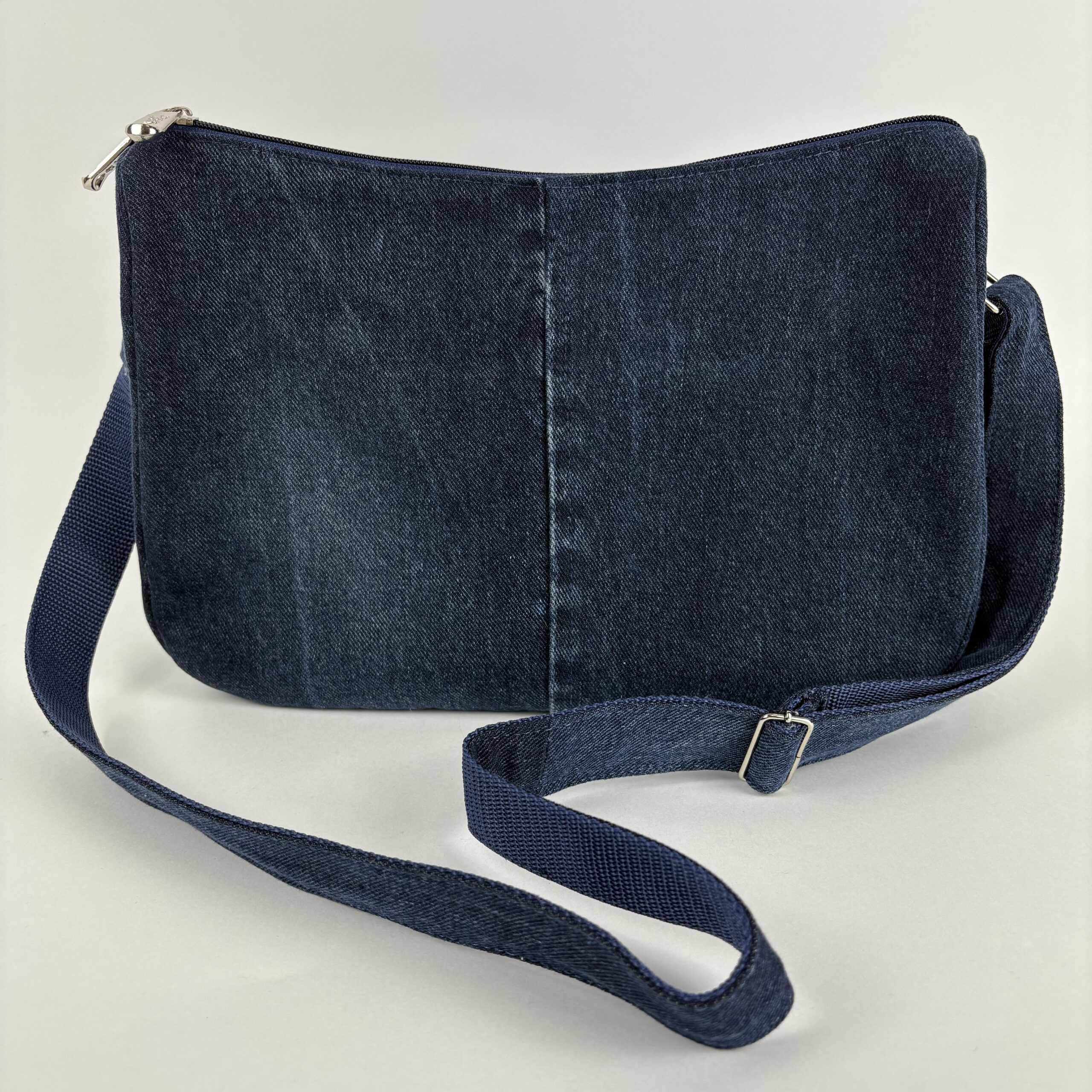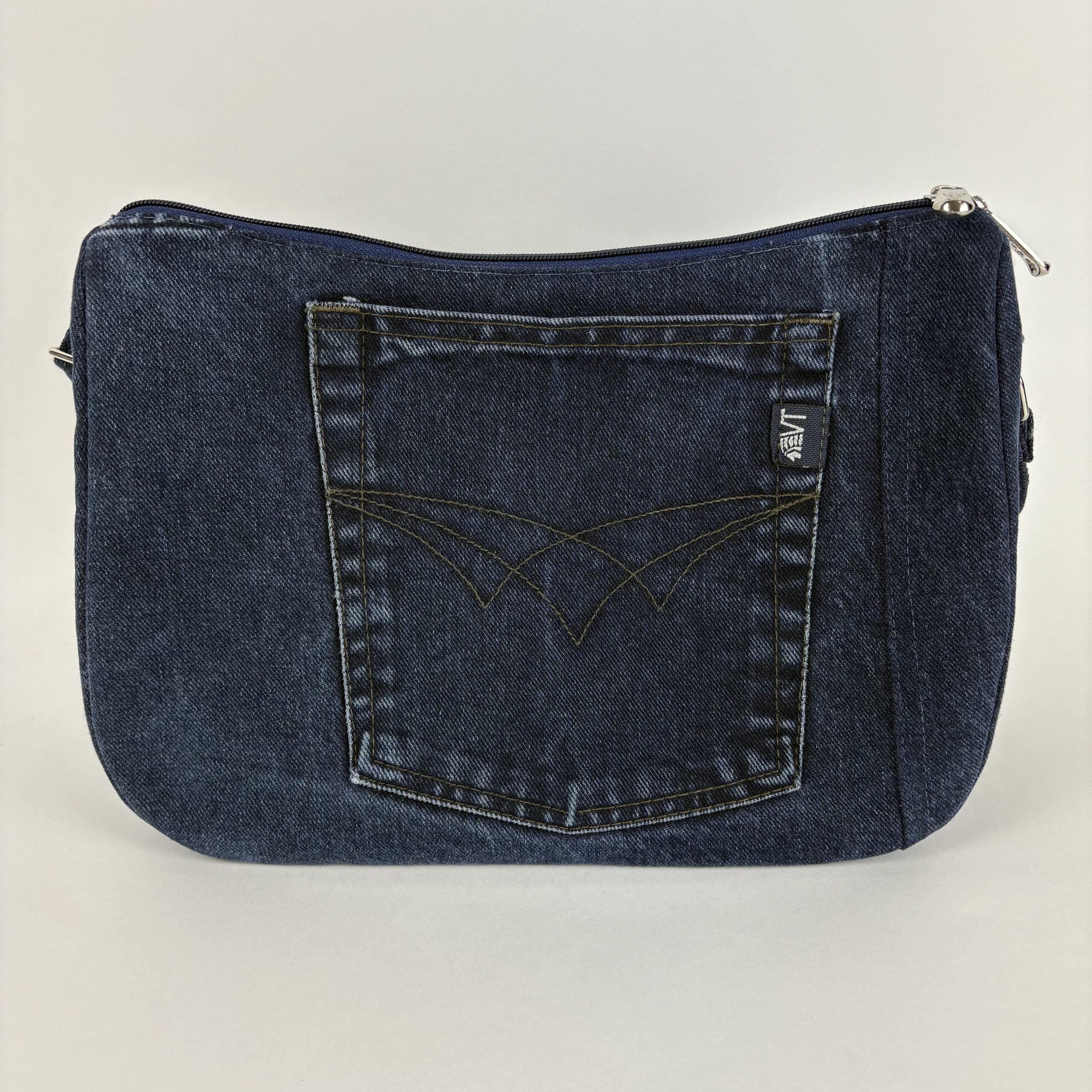 Jeansowa, upcyklingowa torebka o średnim rozmiarze, wykonana z odzyskanych materiałów denimowych. Wyposażona w regulowany pasek oraz zapięcie na zamek, zapewnia wygodę i bezpieczeństwo. Idealna na co dzień dla osób ceniących modę zrównoważoną i praktyczną.